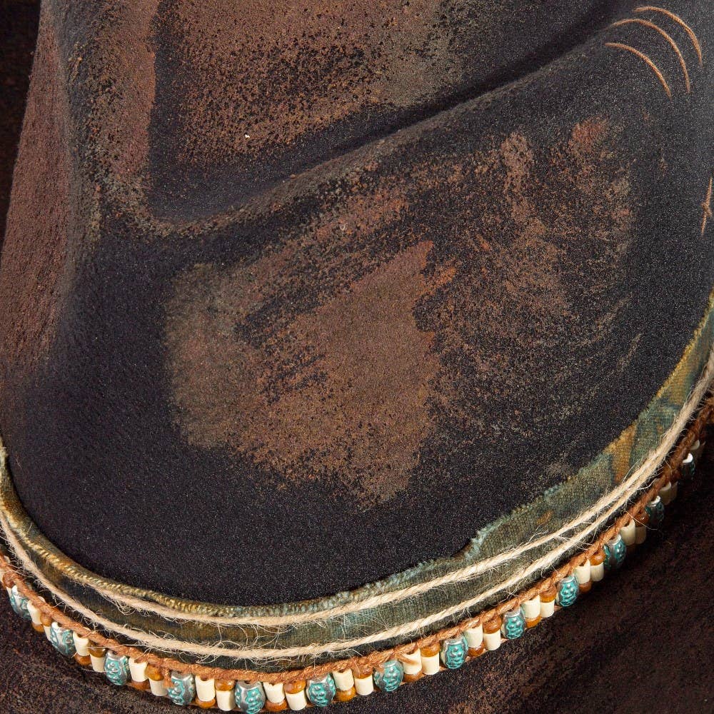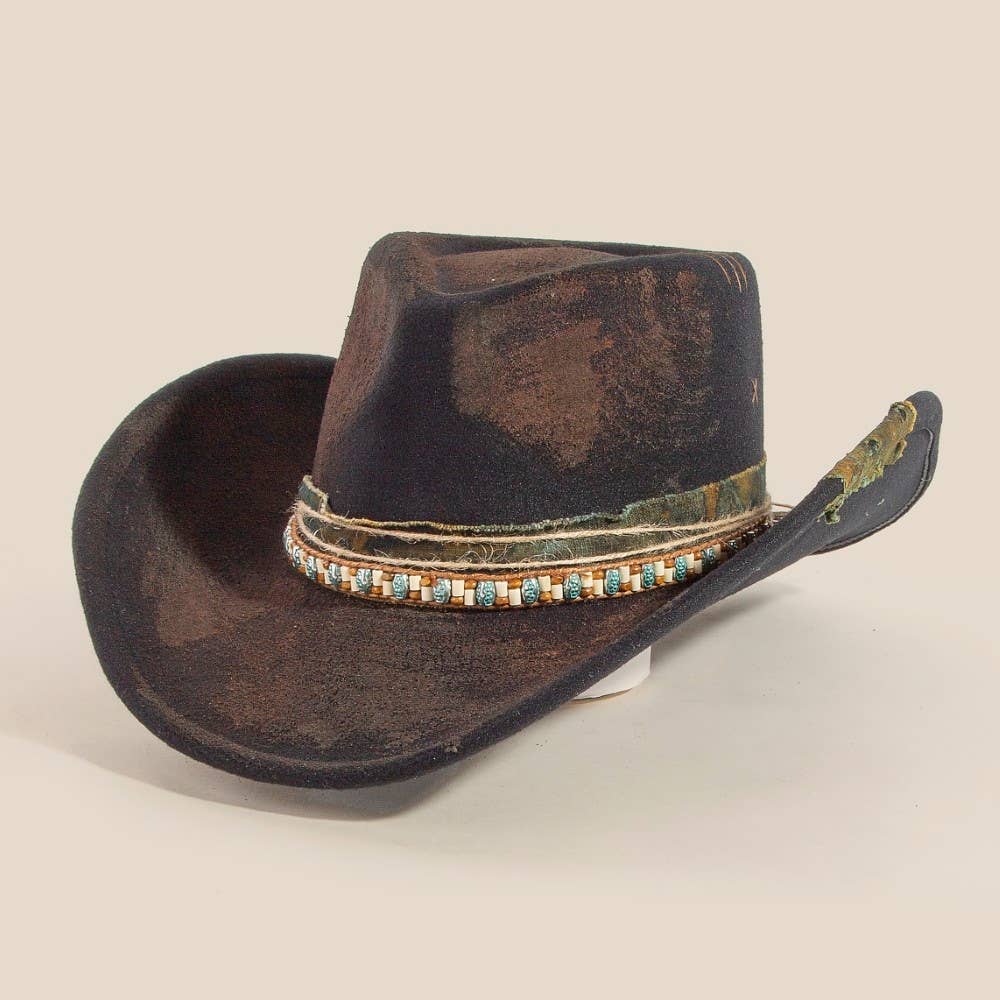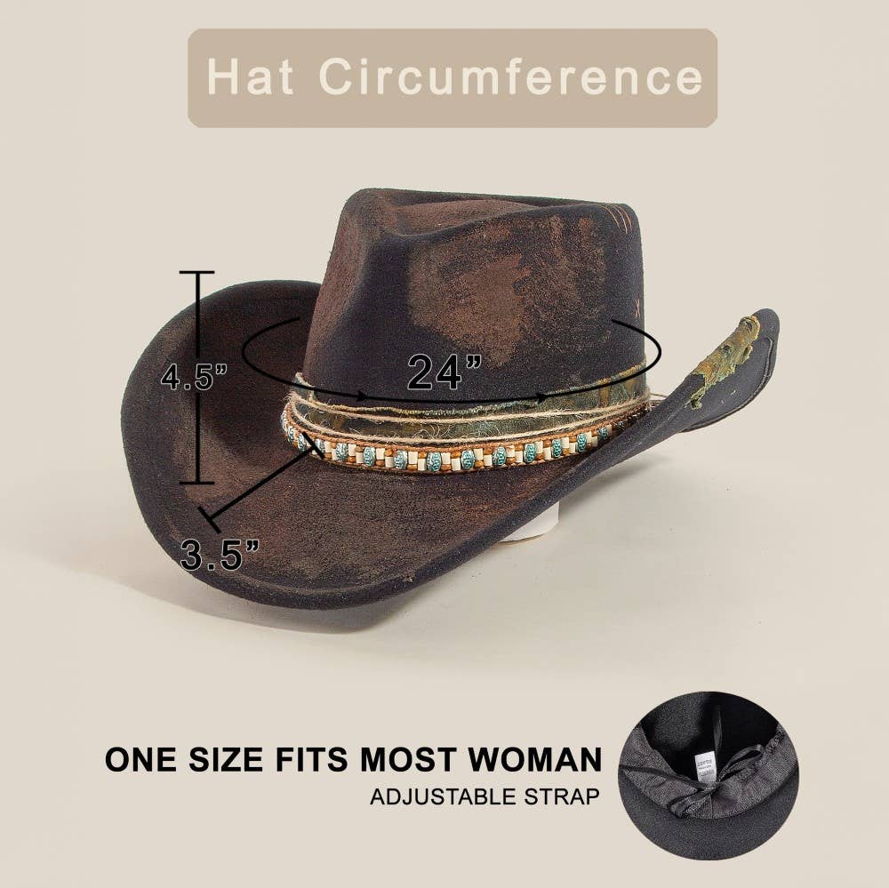 Perfect for any occasion, from casual to formal, this cowboy hat embodies a sophisticated rustic beaded strap western design. Perfect for adding a pop of color or texture to any outfit, this cowboy hat is a must-have. Weathered And Aged Texture This cowboy hat is made with 100% Polyester.