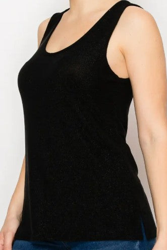 This tank is a subtly sparkly lurex fabric tank top. Inspired by lace and crochet, this tank top reflects a classic yet stylish design. Perfect for those who appreciate understated sparkle and trend-focused pieces. It's a versatile addition to any wardrobe.