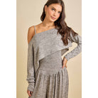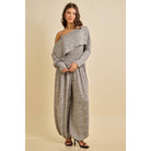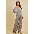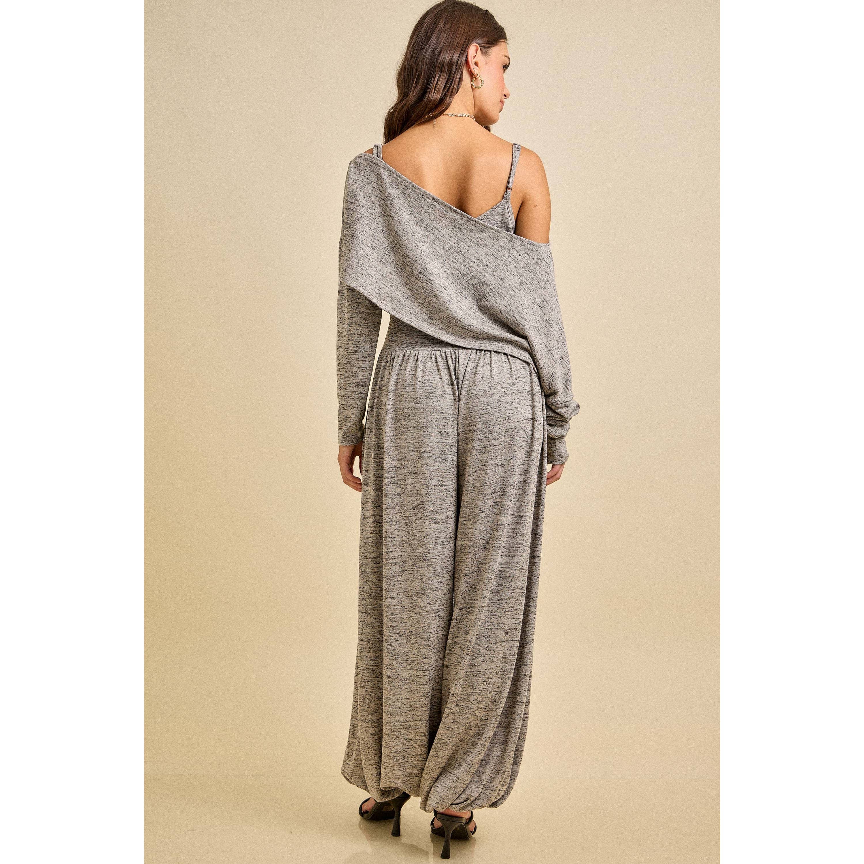 Cozy yet elevated, this knit jumpsuit features an off-shoulder draped neckline and flowy balloon-style pants, perfect for lounging or chic casual days.