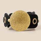 A versatile piece that can be dressed up or down, this belt includes a stunning studded grommet large disc buckle design. This belt is the perfect finishing touch to any outfit, adding a touch of sophistication and glamour.. This belt is made with 70% Polyurethane and 30% Alloy.