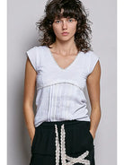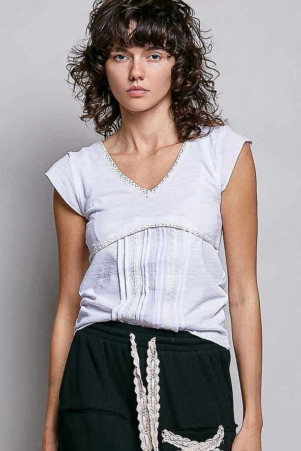 Lightweight textured knit short-sleeve top designed with a flattering, gently fitted silhouette and subtle shaping through the bodice. Features a V neckline trimmed with delicate crochet-style detailing, softly defined empire seam that enhances the natural waist, and vertical stitched accents that add dimension and a handcrafted feel. This top is perfect for layering and effortless everyday styling, blending versatility with timeless bohemian appeal. Specs/Dimensions: - BUST: 15" - LENGTH: 21"