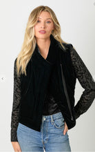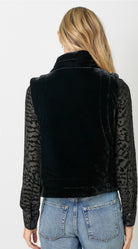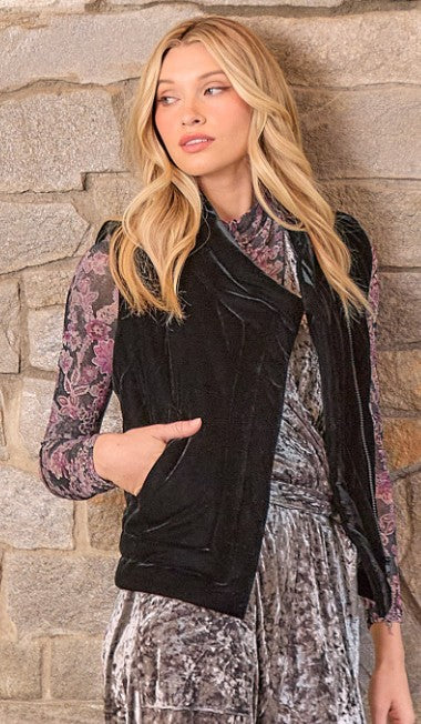 Velvet Puffer Vest Diagonal front Zipper closure Front side pockets -Model is wearing Latte and Black with 57704 shirt / Black with 60776 top and 60785 jumpsuit, Emerald with 60776 top -Self 95% Polyester, 5% Spandex / Lining 100% Polyester -Model wears: S / Model height: 5' 9"
