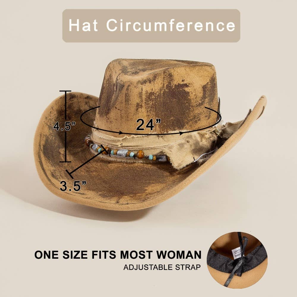 Make a statement, this cowboy hat highlights a special vintage boho feather and beaded strap western design. A versatile cowboy hat that's perfect for any occasion, adding a touch of elegance and style to any outfit. This item is sold in packs of 1. Weathered And Aged Texture This cowboy hat is made with 100% Polyester.