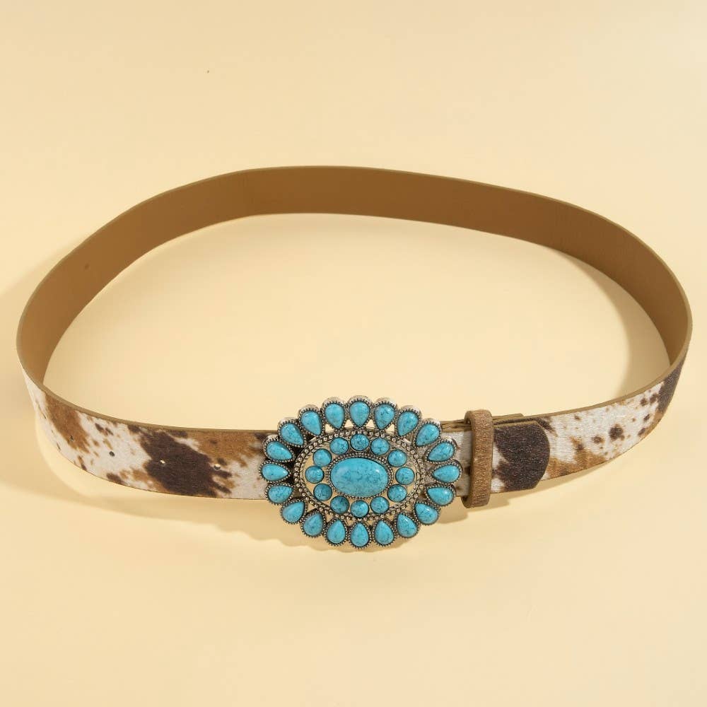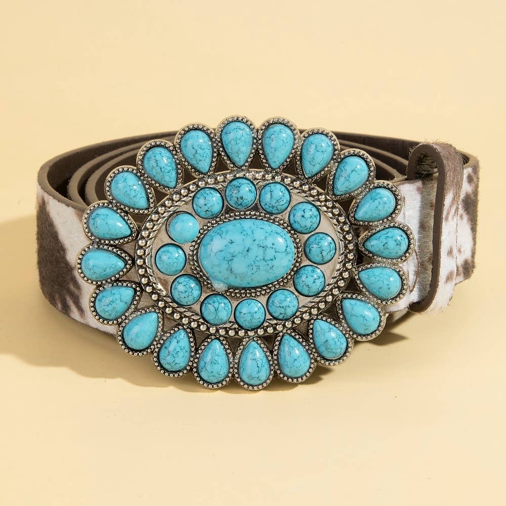 A timeless piece that you'll wear for years to come, this belt boasts a magnificent western concho turquoise stone buckle design. This belt is a great way to add some flair to your outfit without going over the top. This belt approximately measures: Length: 41 Inches This belt is made with 90% Polyester and 10% Alloy.