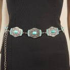 Sleek and modern, this chain belt possesses a fine western mini turquoise stud rectangle concho design. This item is perfect for adding some color and vibrancy to any outfit. This chain belt is made with 100% Alloy.