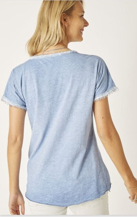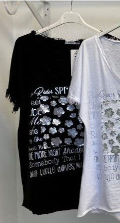 3D Flower and Silver T-Shirt. Rounded v-neckline, lace behind silver flowers and silver writing on front.