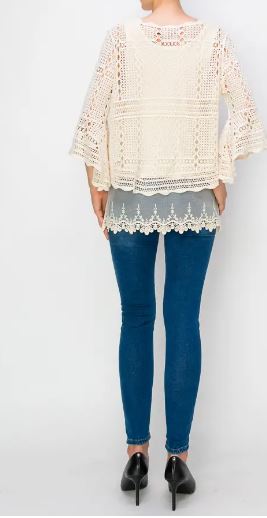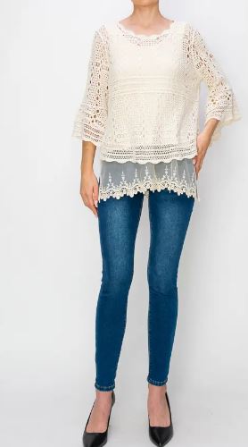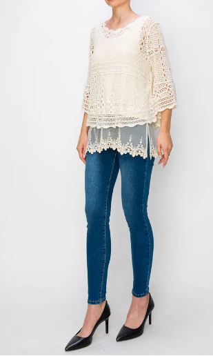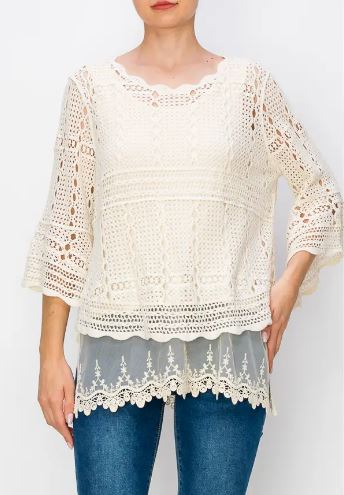 This tunic top features delicate crochet detailing and a 3/4 sleeve design, making it a versatile addition to your wardrobe. Inspired by lace and crochet, this piece embodies our brand's commitment to creating stylish, on-trend, and classic women's clothing. Ideal for both casual and more formal occasions, it's a staple piece for any fashion-forward individual.