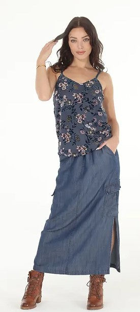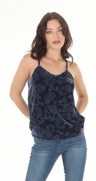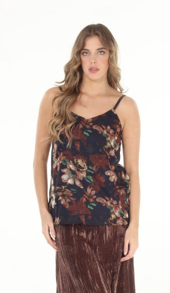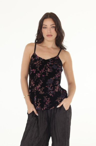 The Velvet burnout cami tank top, slight curved neck, adjustable straps, floral pattern, solid poly knit lining, straight hem.