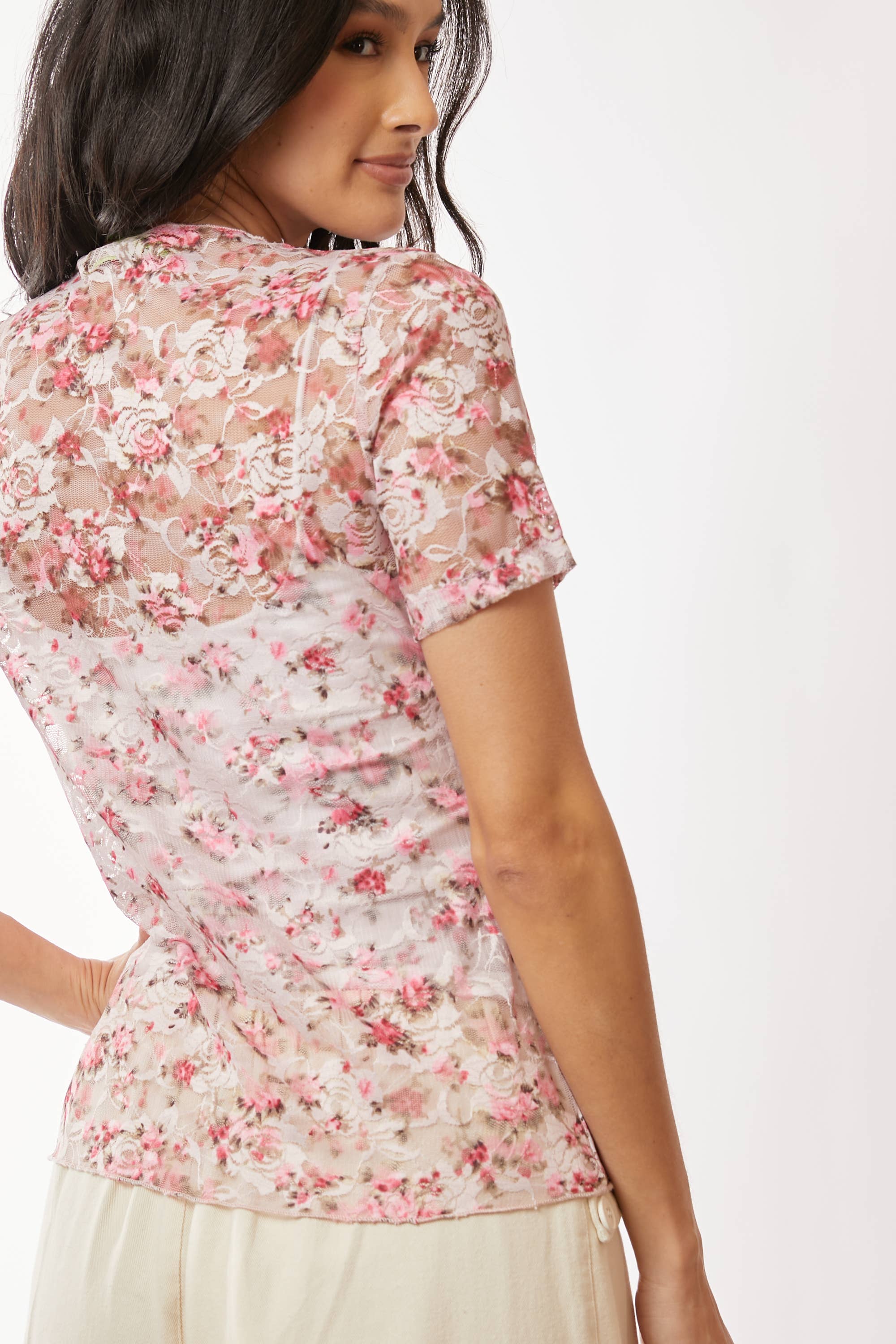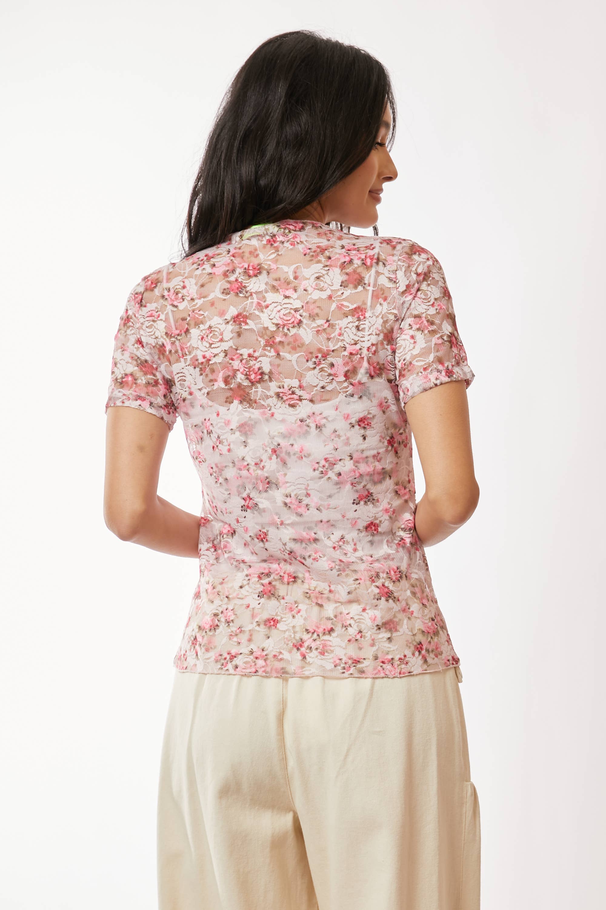Elevate your boutique curation with this romantic sheer mesh top, featuring allover floral lace. Lightweight and feminine, it layers effortlessly for day-to-night styling. A refined essential with delicate texture—perfect for adding charm and versatility to any modern wardrobe. 93%POLYESTER 7%SPANDEX Model is wearing Small Height: 5'10" Bust : 34 Waist : 25” Hips : 35”