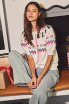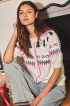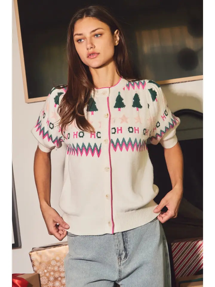 Crew neck button front cardigan with puff sleeves, festive jacquard pattern of trees, stars, zigzags and "HO HO" lettering. Total Length: 22" Content: 50% Viscose, 28% Nylon, 22% Polyester