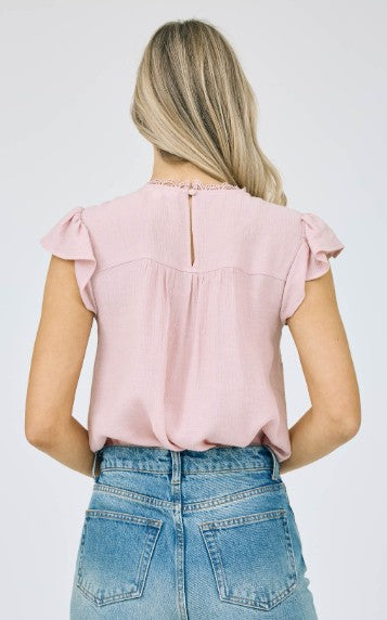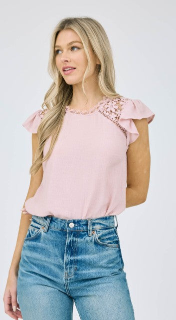 ROUND NECKLINE SCALLOP NECK TRIM BACK KEYHOLE CLOSURE SHOULDER PANEL LACE DETAIL SOLID NOT LINED LIGHTWEIGHT WOVEN TOP SELF: 87% RAYON, 13% NYLON CONTRAST: 100% POLYESTER