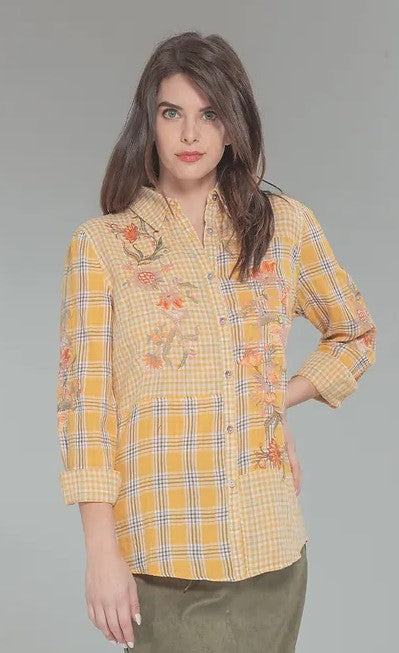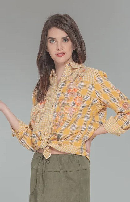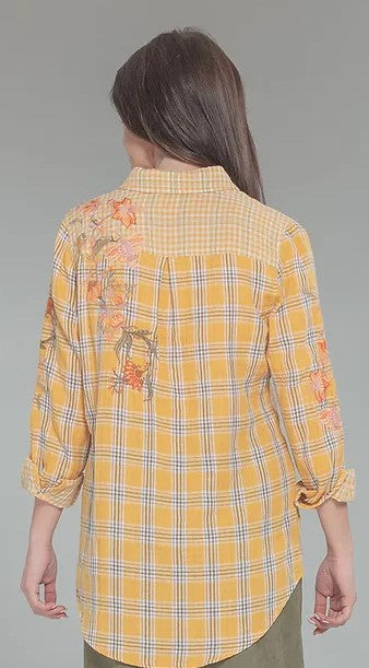 Double face voile camp shirt, multi plaid and check pattern, button front with collar, long sleeve with button cuffs, front and back embroidery detail. It is so cute left out used as a flannel or tied in front.