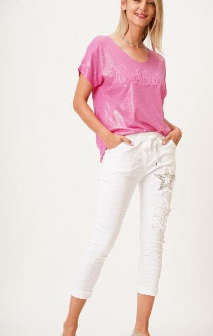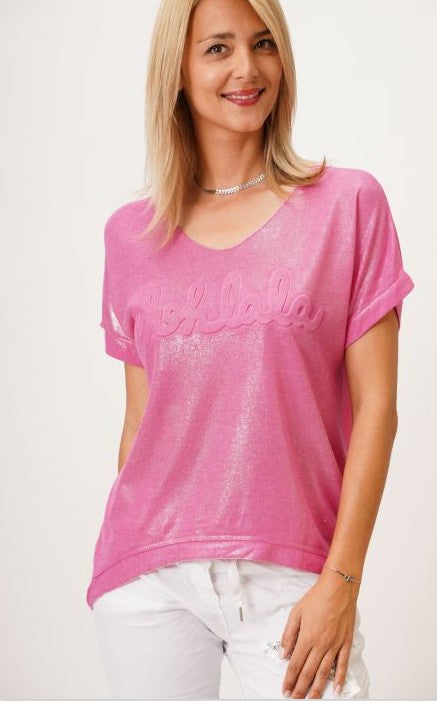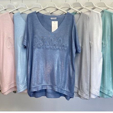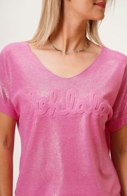 Shimmer "Oohlala" Short Sleeve Shirt. Rounded v-neckline, silver thread hem, shimmer on front of shirt.