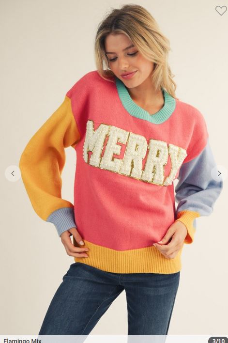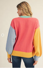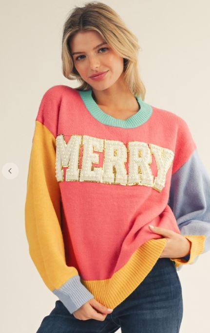 Drop shoulder color blocked merry sweater top with pearl accent.