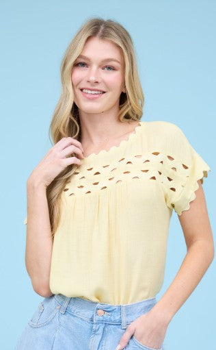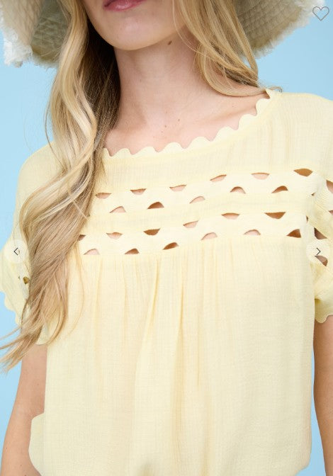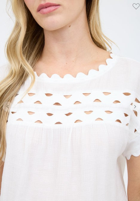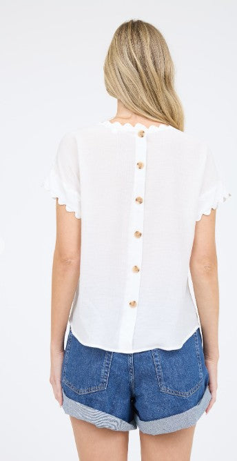 BOAT NECKLINE SCALLOP TRIM DETAIL SHORT SLEEVES SCALLOP SLEEVE CUT-OUT YOKE DETAIL BACK BUTTON NON-FUNCTIONAL BUTTONS SOLID NOT LINED SELF: 87% RAYON, 13% NYLON CONTRAST: 100% COTTON