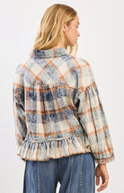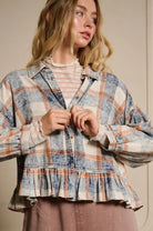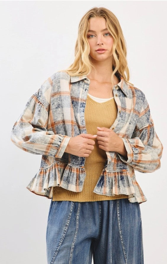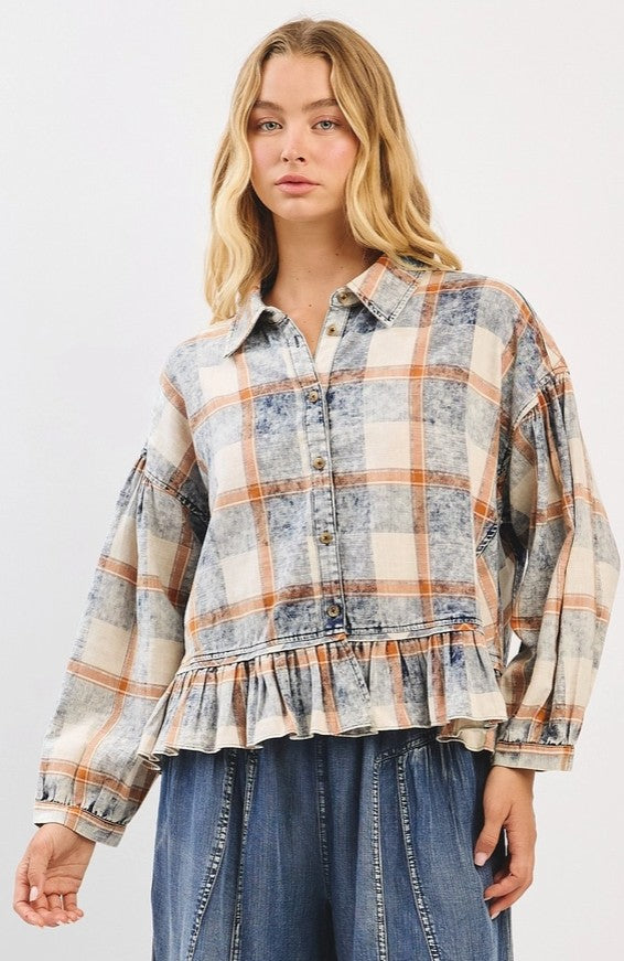 - PLAID PRINT FABRIC - WASHED - COLLAR - BUTTON DOWN FRONT - LONG BALLOON SLEEVE WITH BUTTONED CUFF - RUFFLE PEPLUM HEM - LOOSE FIT MODEL IS 5'8" AND WEARING SIZE SMALL # fall, winter, plaid print, flannel, mineral wash, collared, button up, buttoned, shirt, top, blouse, long sleeves, ruffle hem, boho, bohemian, western, cozy, oversized fit 70% COTTON, 30% POLYESTER
