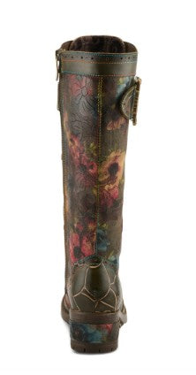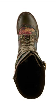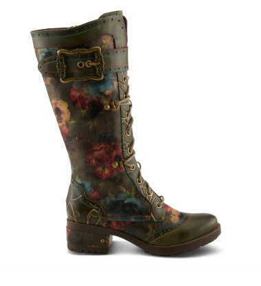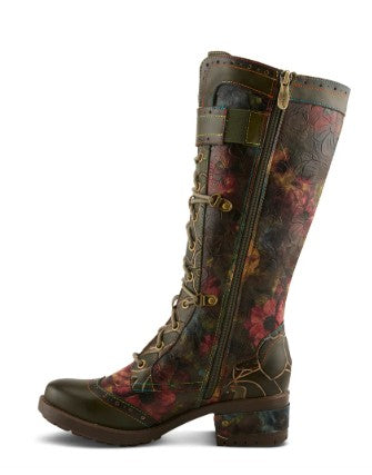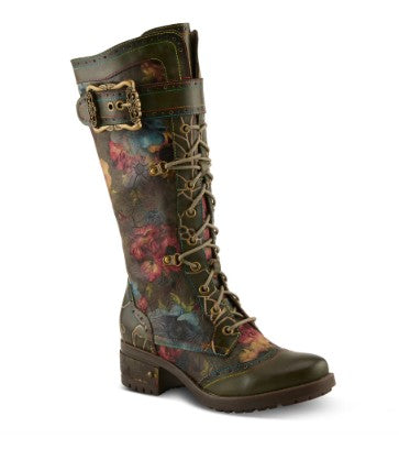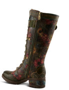 Command attention with this vintage-inspired masterpiece—a boot that fuses artistry with modern sophistication. Crafted with an unique leather combo upper, this knee-high stunner boasts an intricate floral design that evokes vintage elegance. A striking lace-up front is accented with an ornate side buckle, offering an exquisite balance of structure and femininity. The signature rainbow stitching and delicately etched heel lend an artisanal touch, elevating the boot to wearable art. Designed for comfort without compromising style, it features an inside zip for effortless wearability. This show-stopping piece is the epitome of rock and role vibes with everyday practicality.