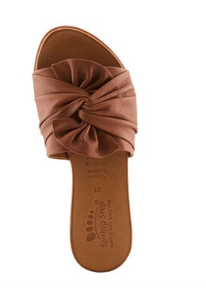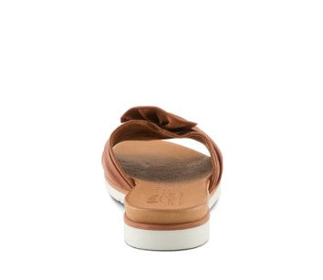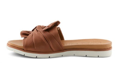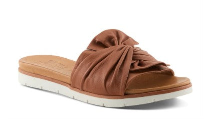 Slip on style with this beautiful slide sandal with a leather bow twist detail. In a rainbow of colors and a flexible outsole for comfort, this is your go-to slide for the season. Small V-goring located underneath the bow allows for additional adjustability. Plus everything your foot touches is leather.