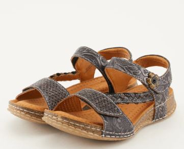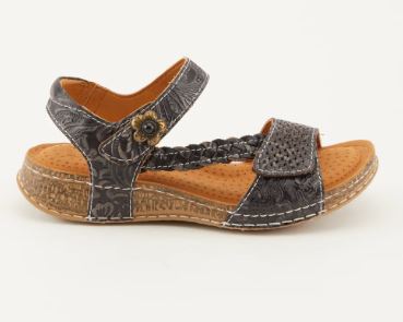 Fashion and leisure. This leather sandal was made for both. The embossed floral pattern, lattice work at the top and braided asymmetrical side strap with an antiqued flower gives it a rich combination of details. The Hook and Loop Velcro closure and padded back strap make for a secure and comfortable fit. Perfect for an active day or to just kick your feet up and relax.