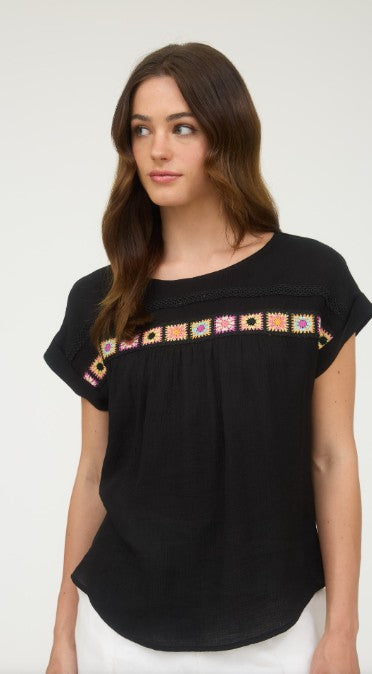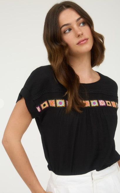ROUND NECKLINE SHORT SLEEVES CUFF SLEEVES LACE TRIM DETAIL CROCHET FLORAL DETAIL YOKE DETAIL WITH PINTUCK SELF: 86% RAYON, 14% NYLON CONTRAST: 100% POLYESTER