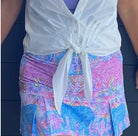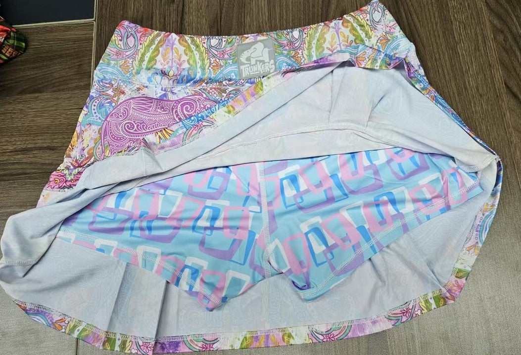 Our Bohemian Rhapsody design is sure to sell out fast. Vibrant elephants on a bohemian inspired print background, with fun retro mid century pattern on shorts. Mid Country Club length. See measurements below. Perfect for playing tennis, comfortable for all day wear or dress it up with a pair of heels for a night out. Sizes Small through XL available. Small (0/2) Medium (4/6) Large (8/10) , XL (12/14) Country Club Lengths: Small 15” / Medium 15” / Large 17” / XL 17”