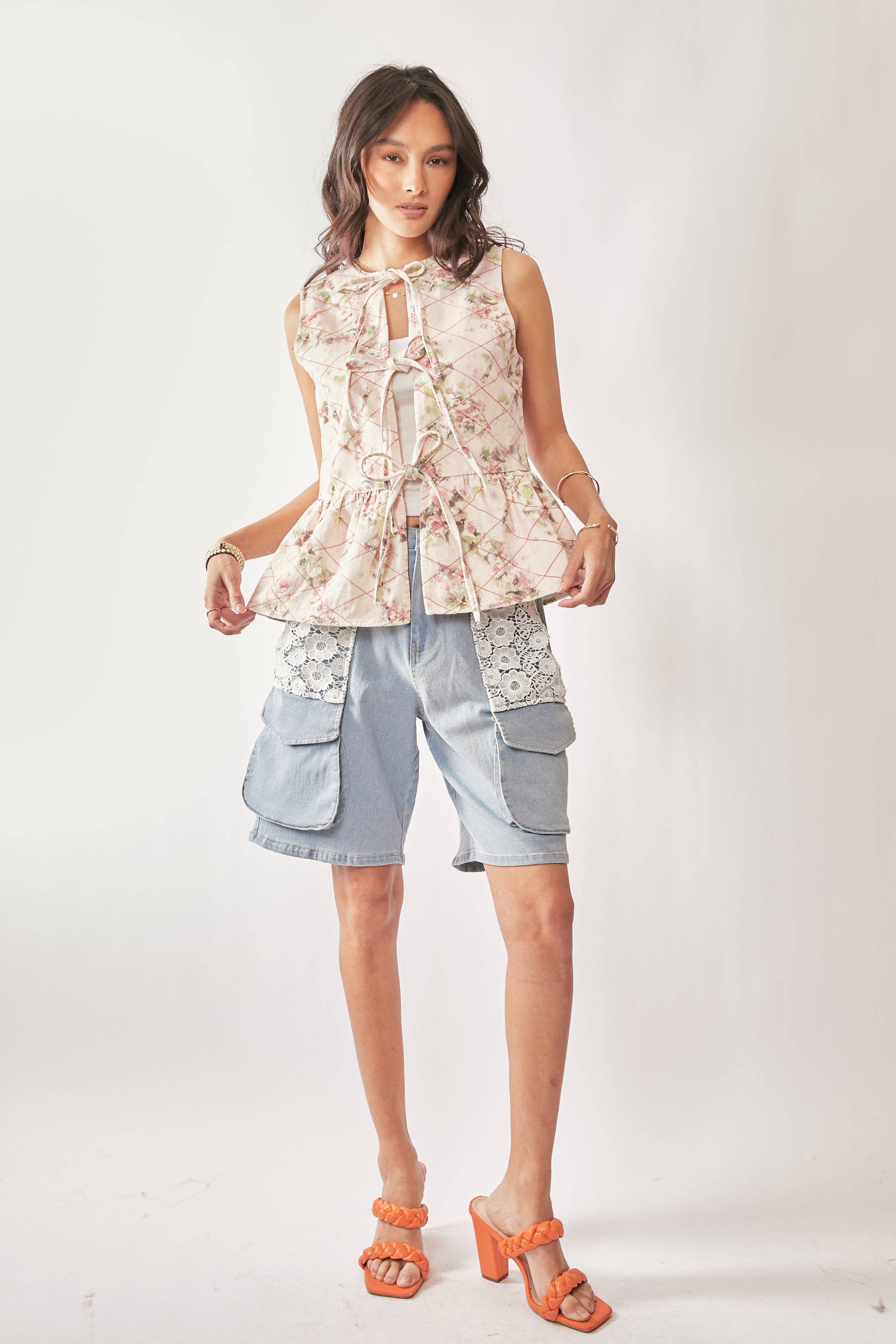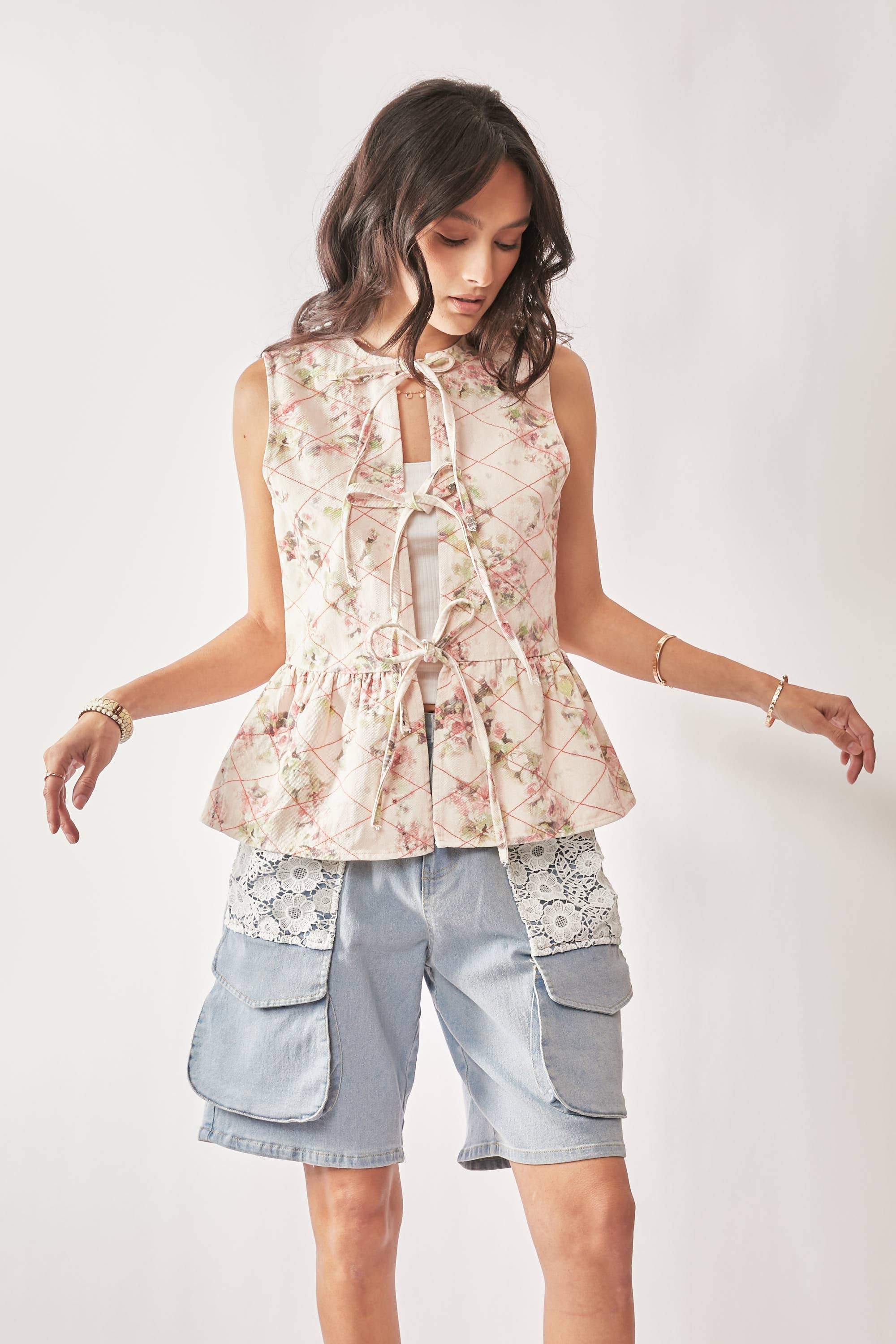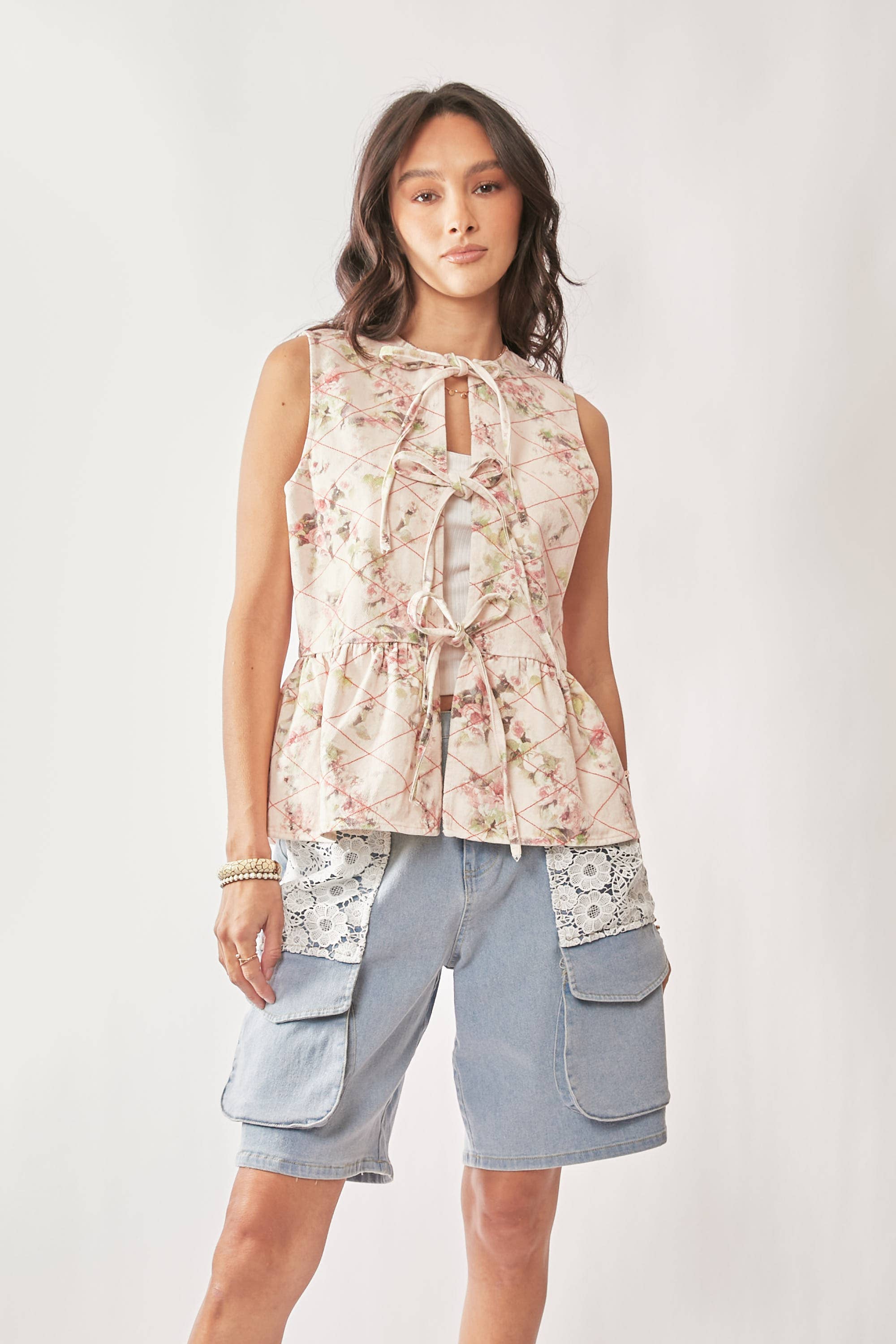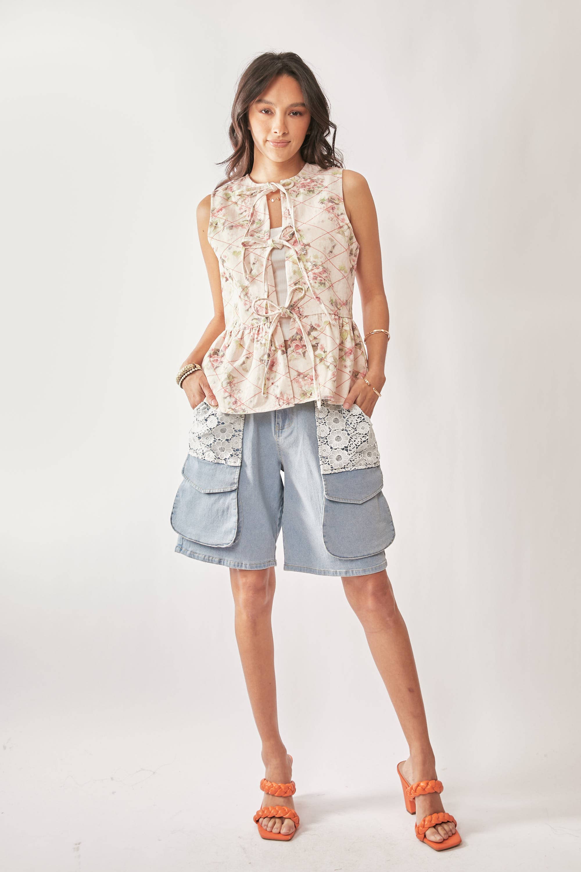 GARDEN FLORAL PRINTED DENIM TIE FRONT VEST JACKET