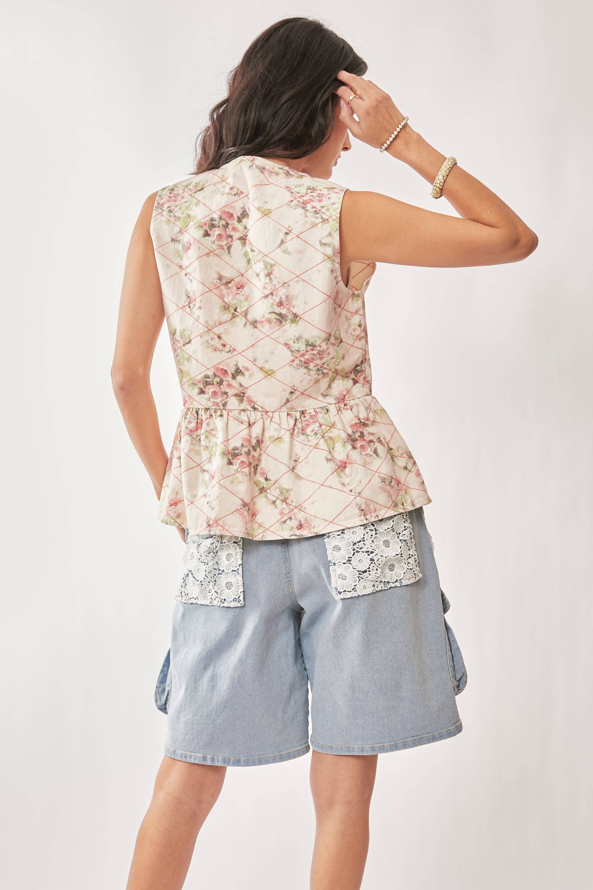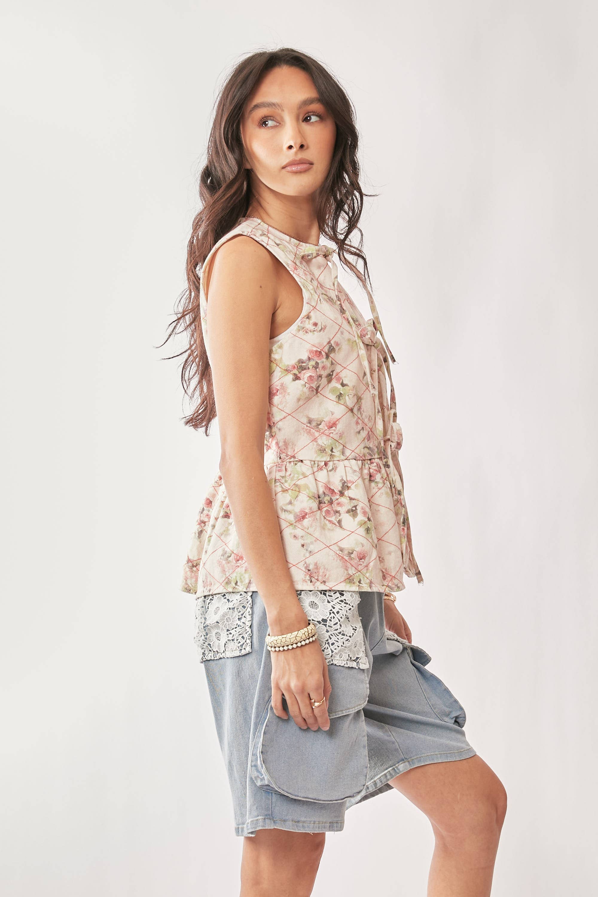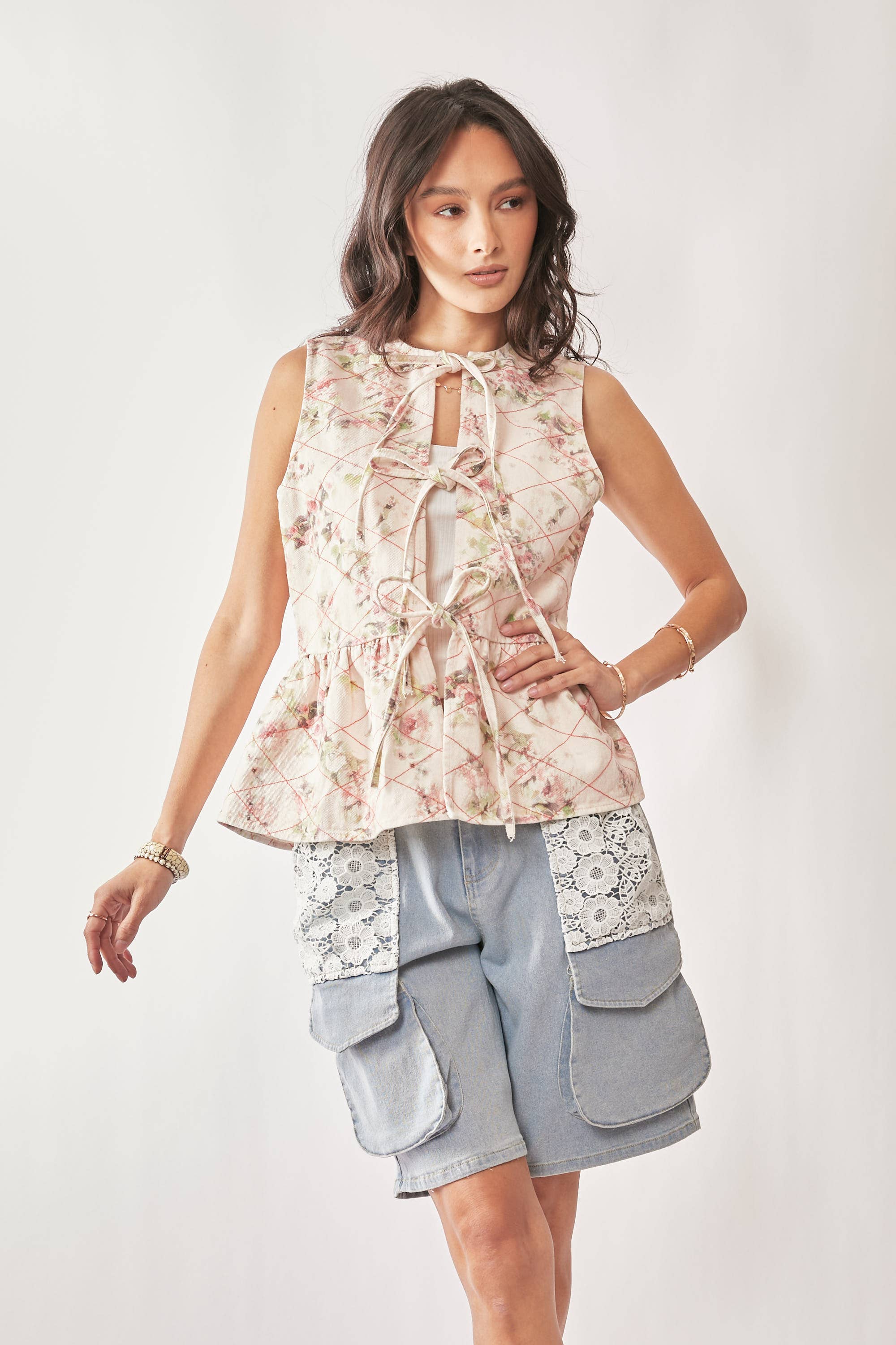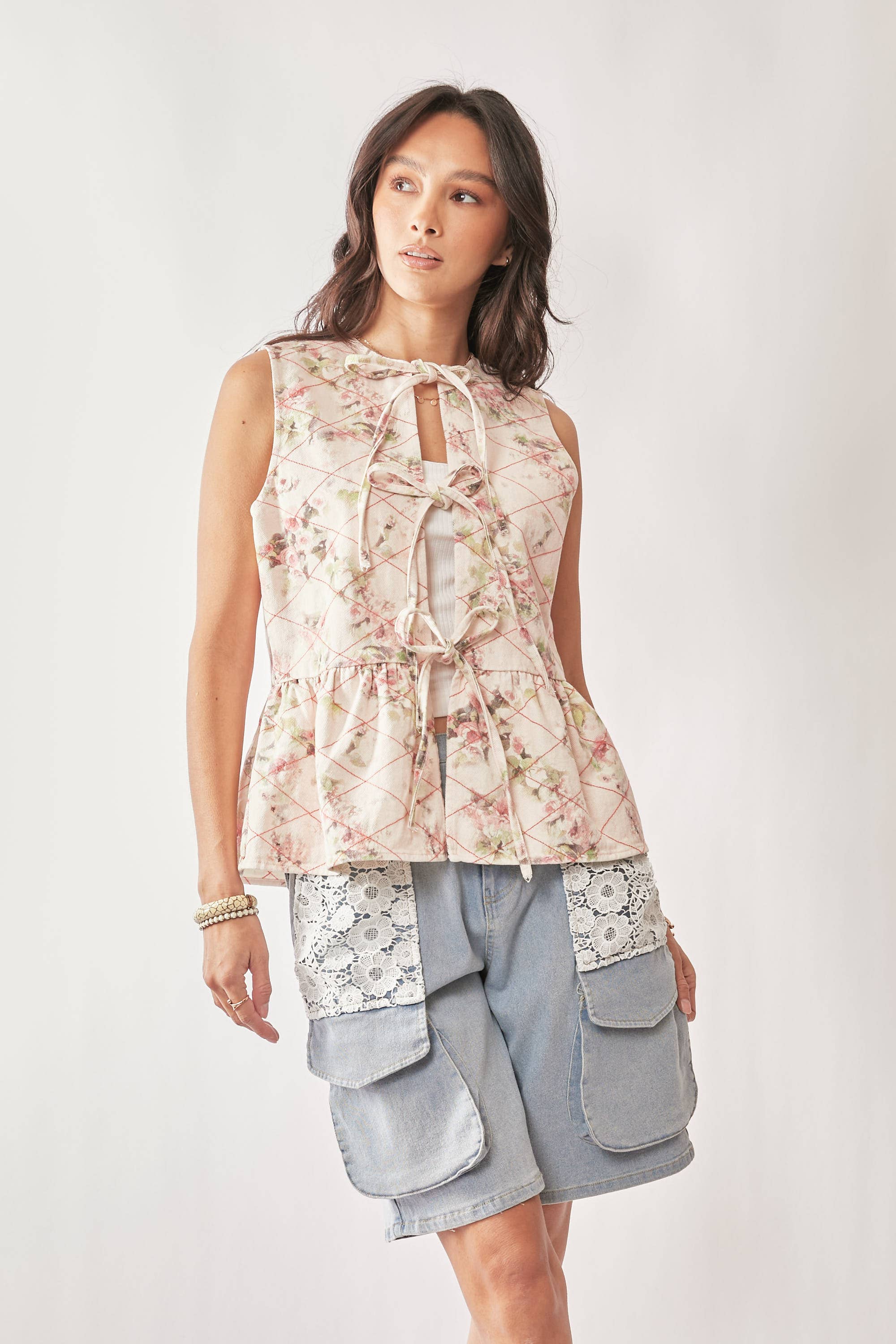 GARDEN FLORAL PRINTED DENIM TIE FRONT VEST JACKET