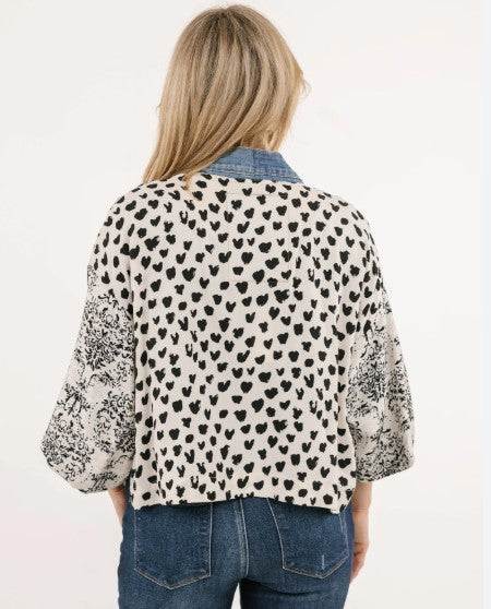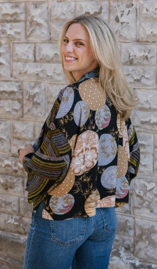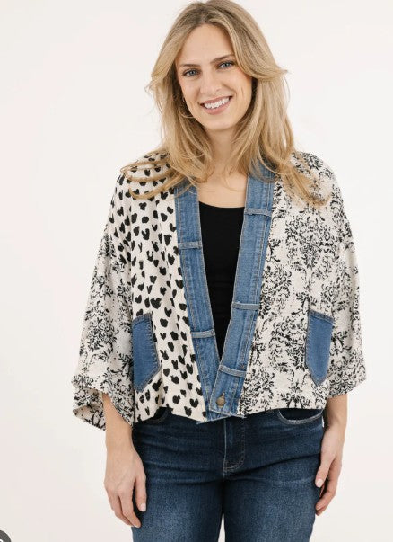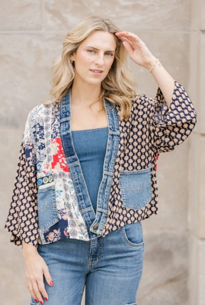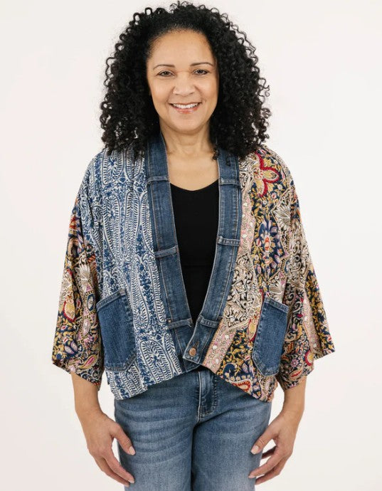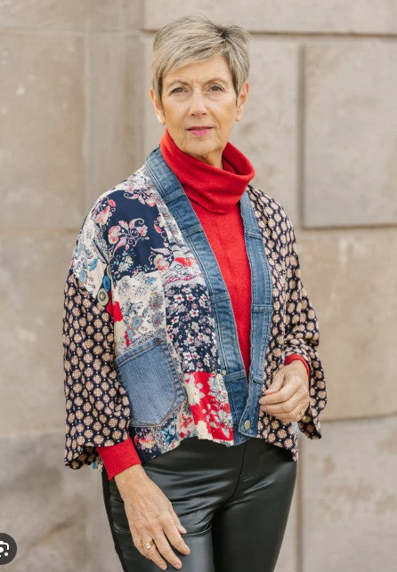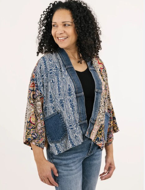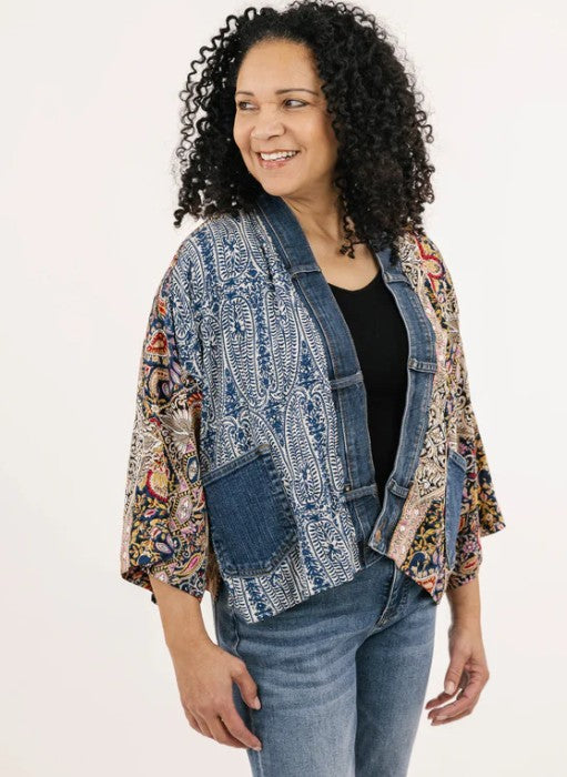 Make a statement with our Karol Cardigan. With the elegant prints made with care by our woman’s co-op in Thailand and our deconstructed vintage upcycled denim, you’ll have all eyes on you.
