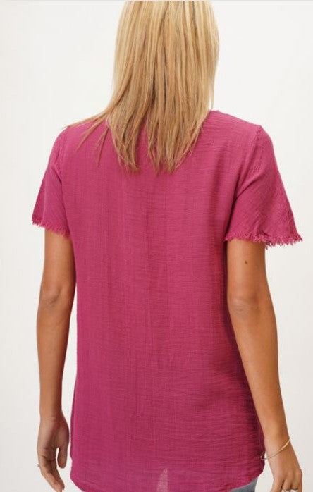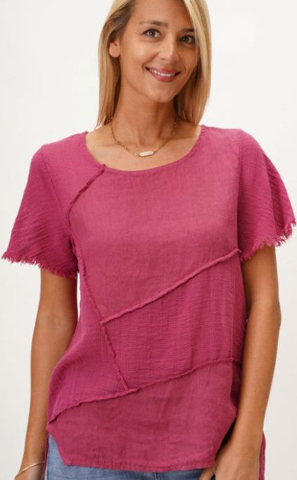 Mix Material Linen Top. Round neckline, short sleeve, cotton and linen mix on front and cotton on back.