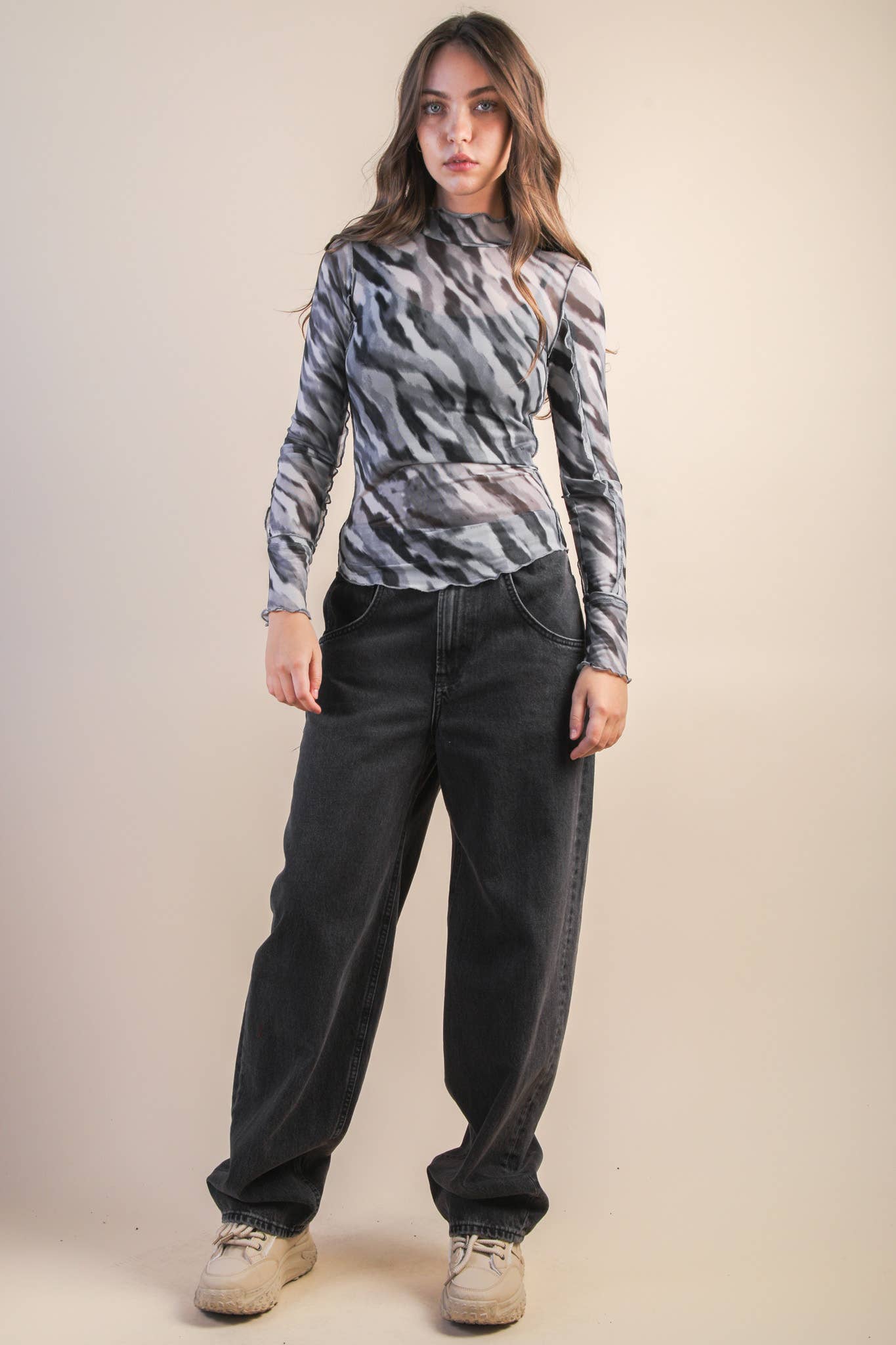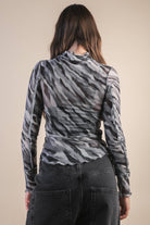 - Zebra Printed See Thru Fitted Lace Top - Mock Neck - Long Sleeve (Model height: 5'9", wearing a Small