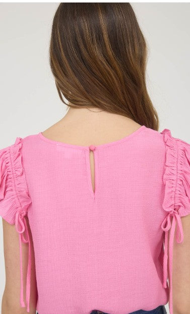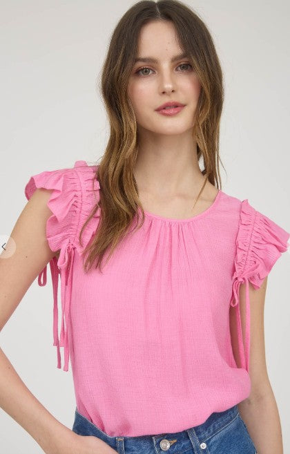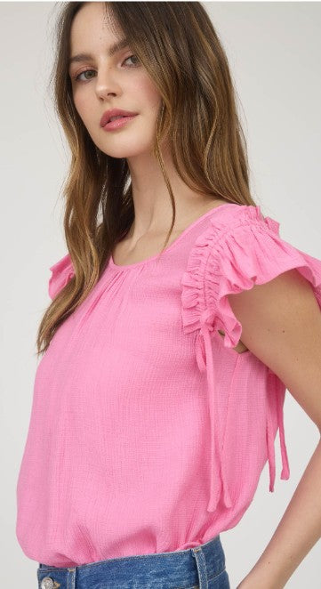 ROUND NECKLINE RUCHED NECKLINE SHORT RUFFLE SLEEVES SLEEVE DRAWSTRING DETAIL BACK EYE CLOSURE SOLID LIGHTWEIGHT NOT LINED WOVEN TOP 80% RAYON 20% NYLON