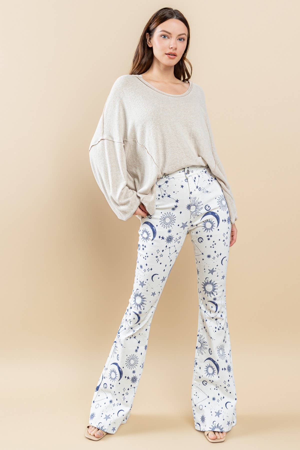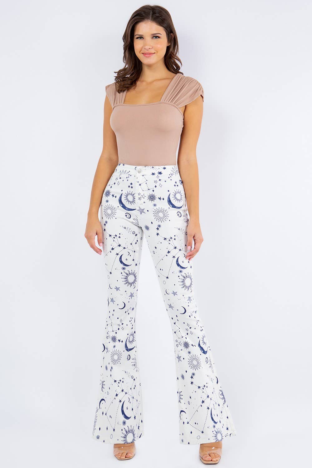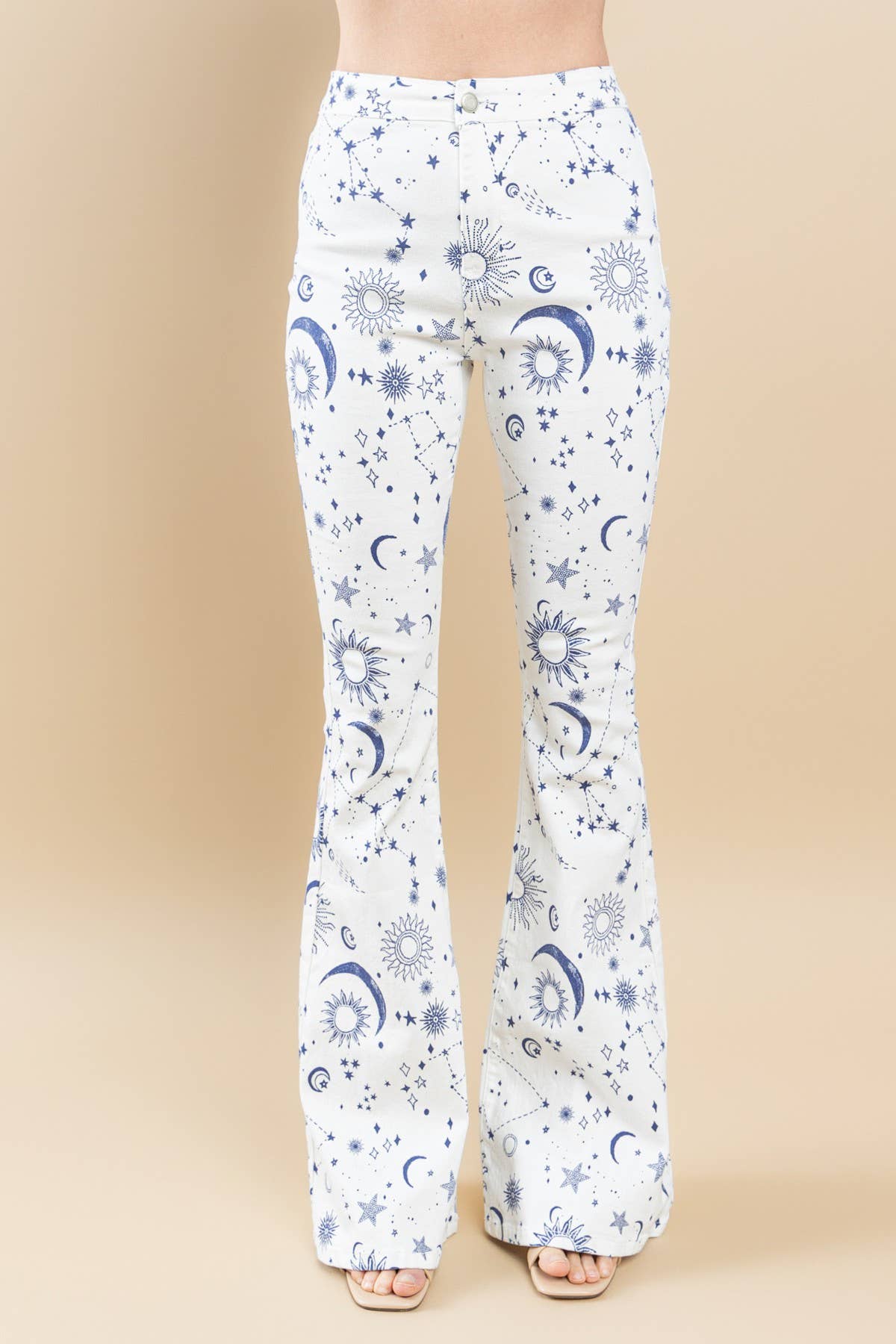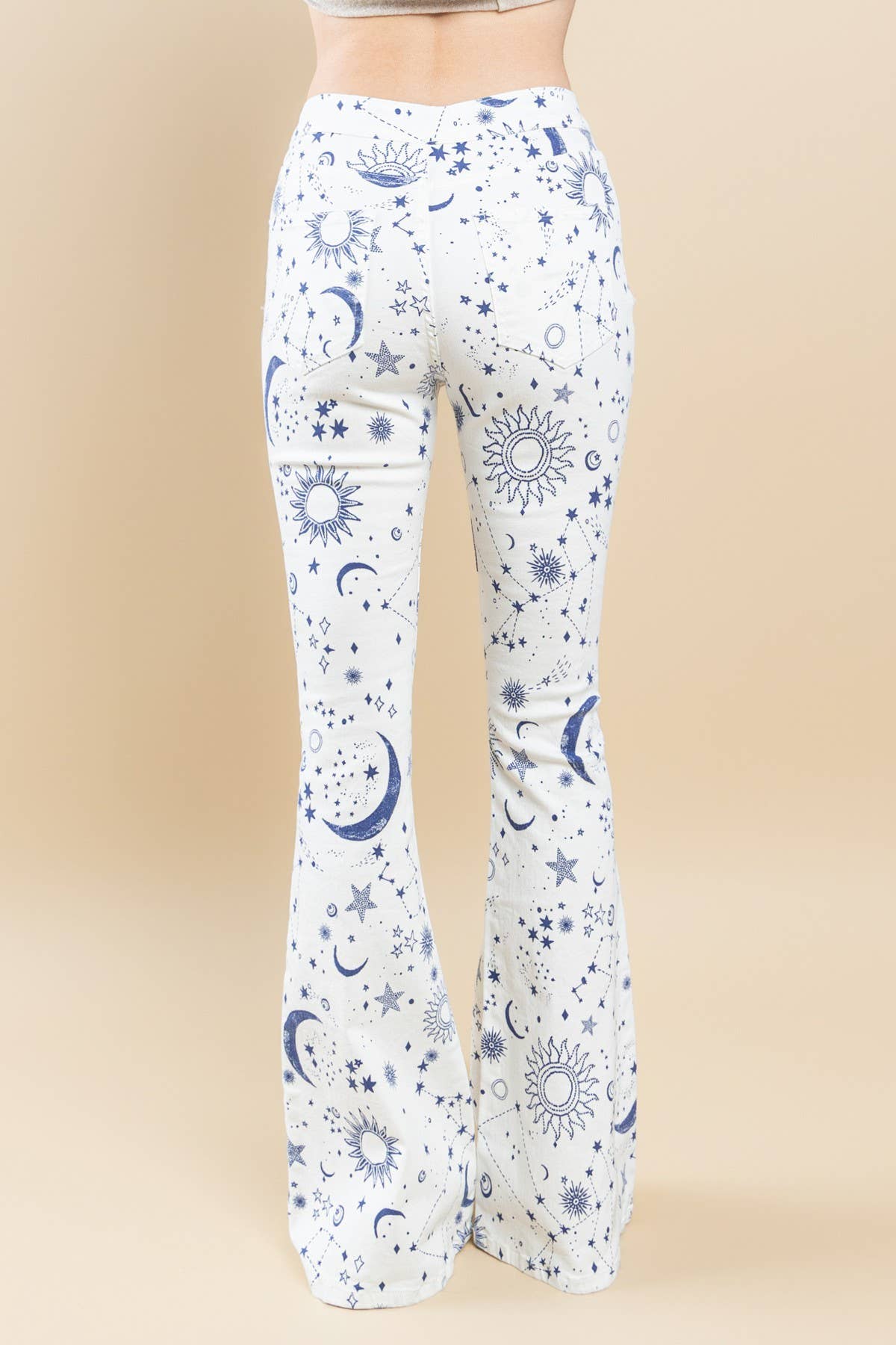STRETCHY SUN AND STAR PRINTED BELLBOTTOM FLARE JEANS WITH 34" INSEAM #RODEO, FLARES, FLARED, NFR, BOHO, BOHEMIAN, COSMIC FLARE JEANS, SUN AND MOON JEANS