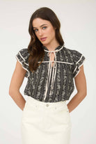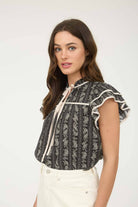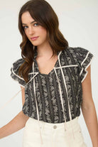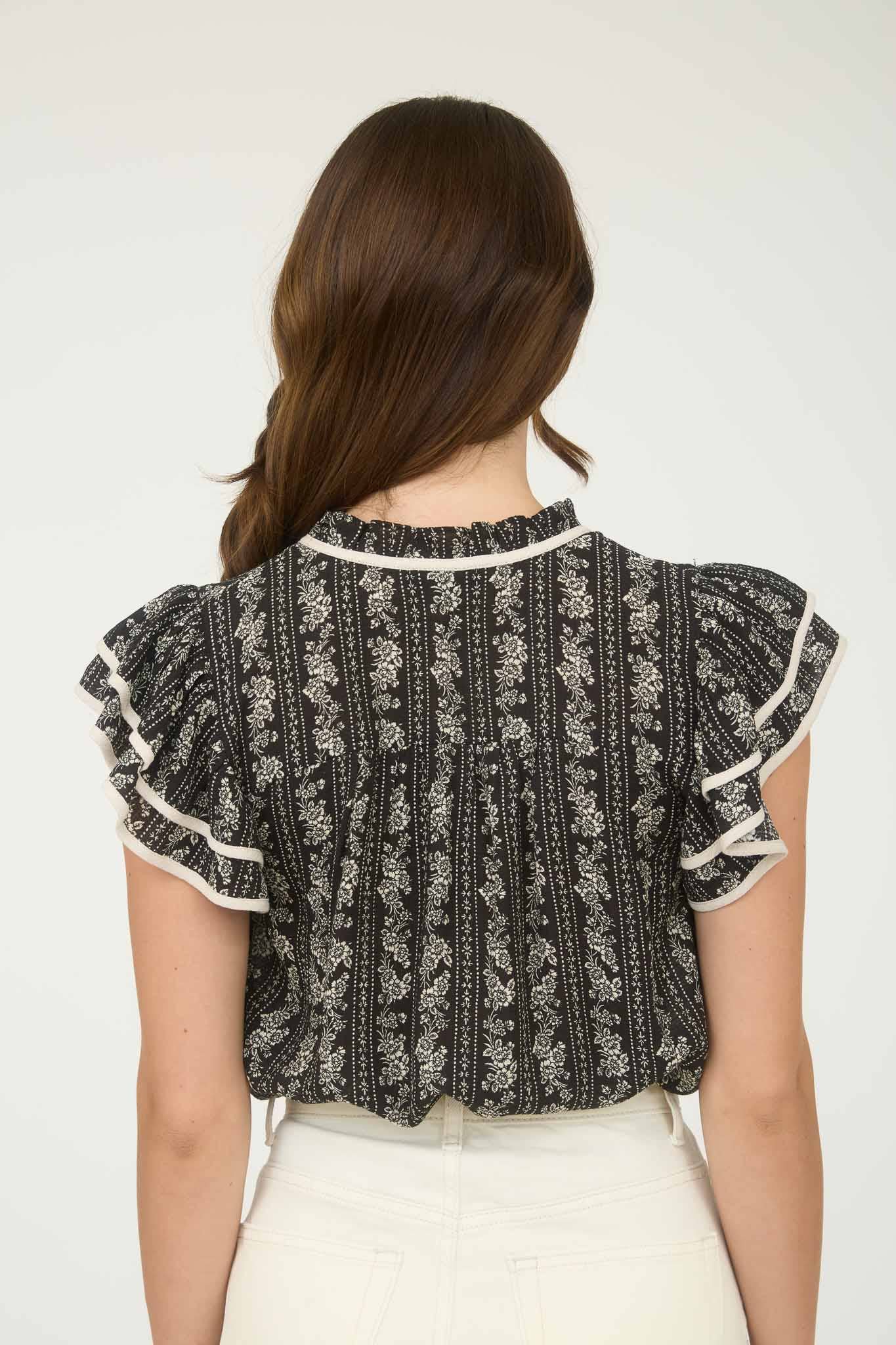 V NECK SHORT RUFFLE LAYERED SLEEVE DOUBLE FRONT TIE RUFFLE TRIM DETAIL RELAXED FIT LIGHTWEIGHT FABRIC NOT LINED STRIPE FLORAL PATTERN WOVEN TOP 87%RAYON 13%NYLON