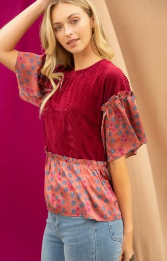 • Round neck with band • Button and elastic loop opening on back neck • Wide ruffle sleeve • Ruffle on bottom hem line • Textured velvet fabric & printed satin fabric Size information: Model height 5' 10", wearing size Small