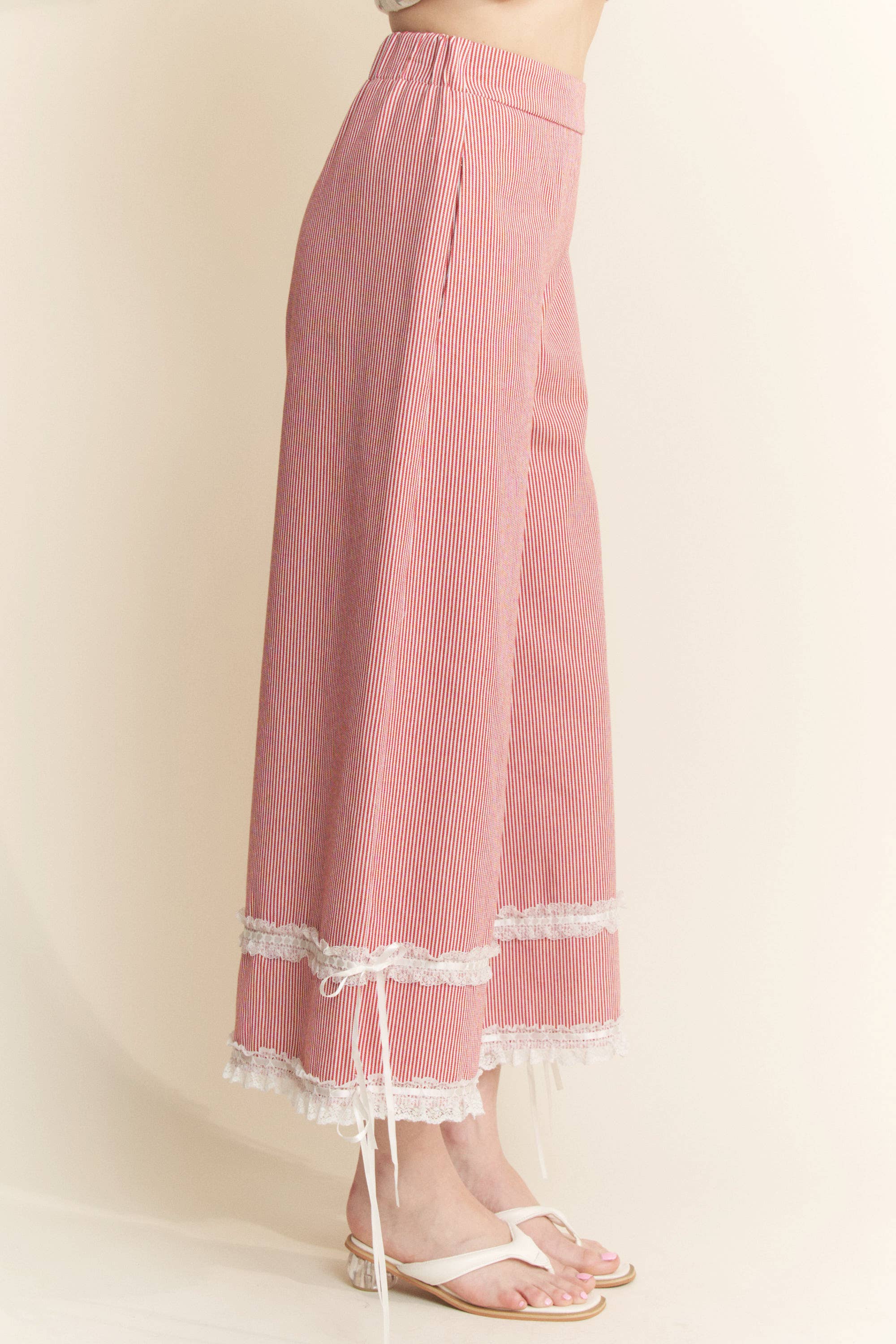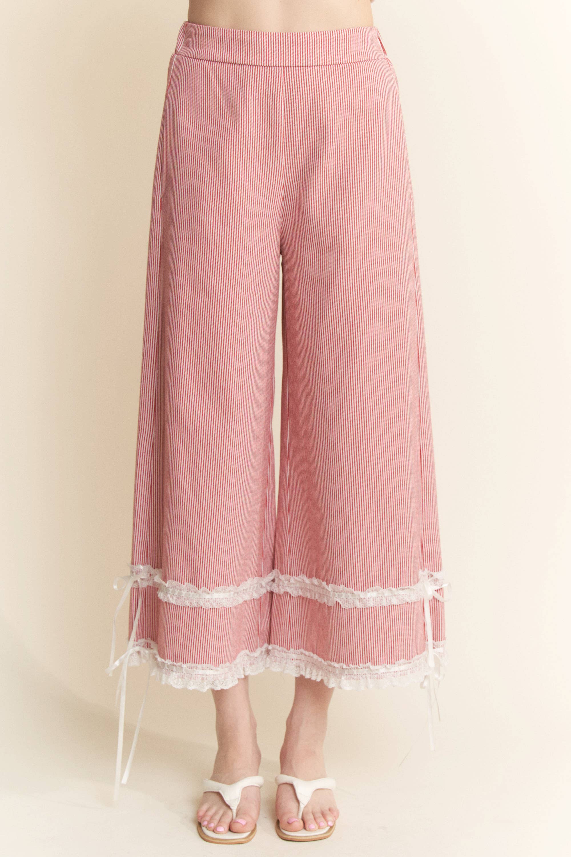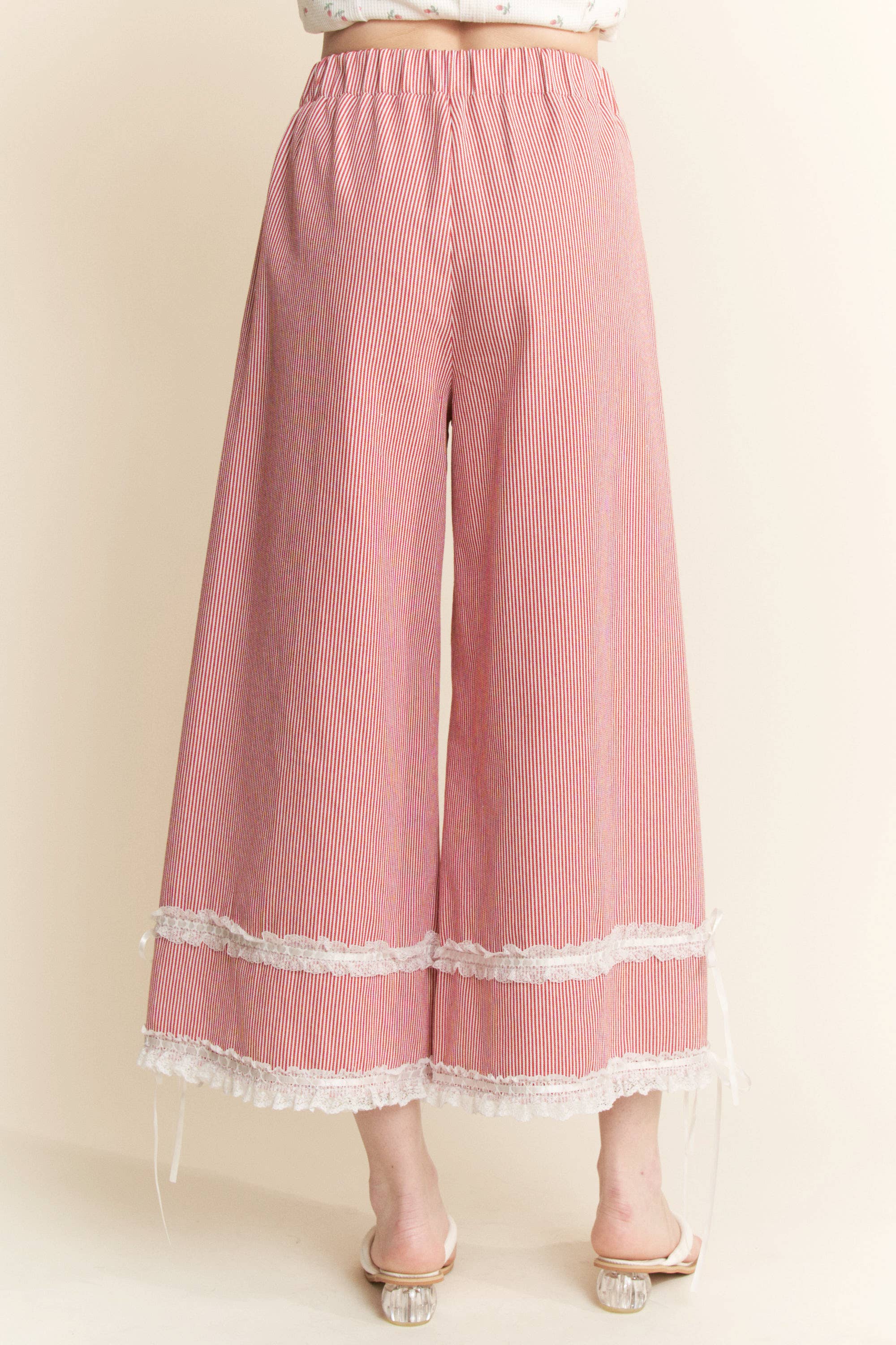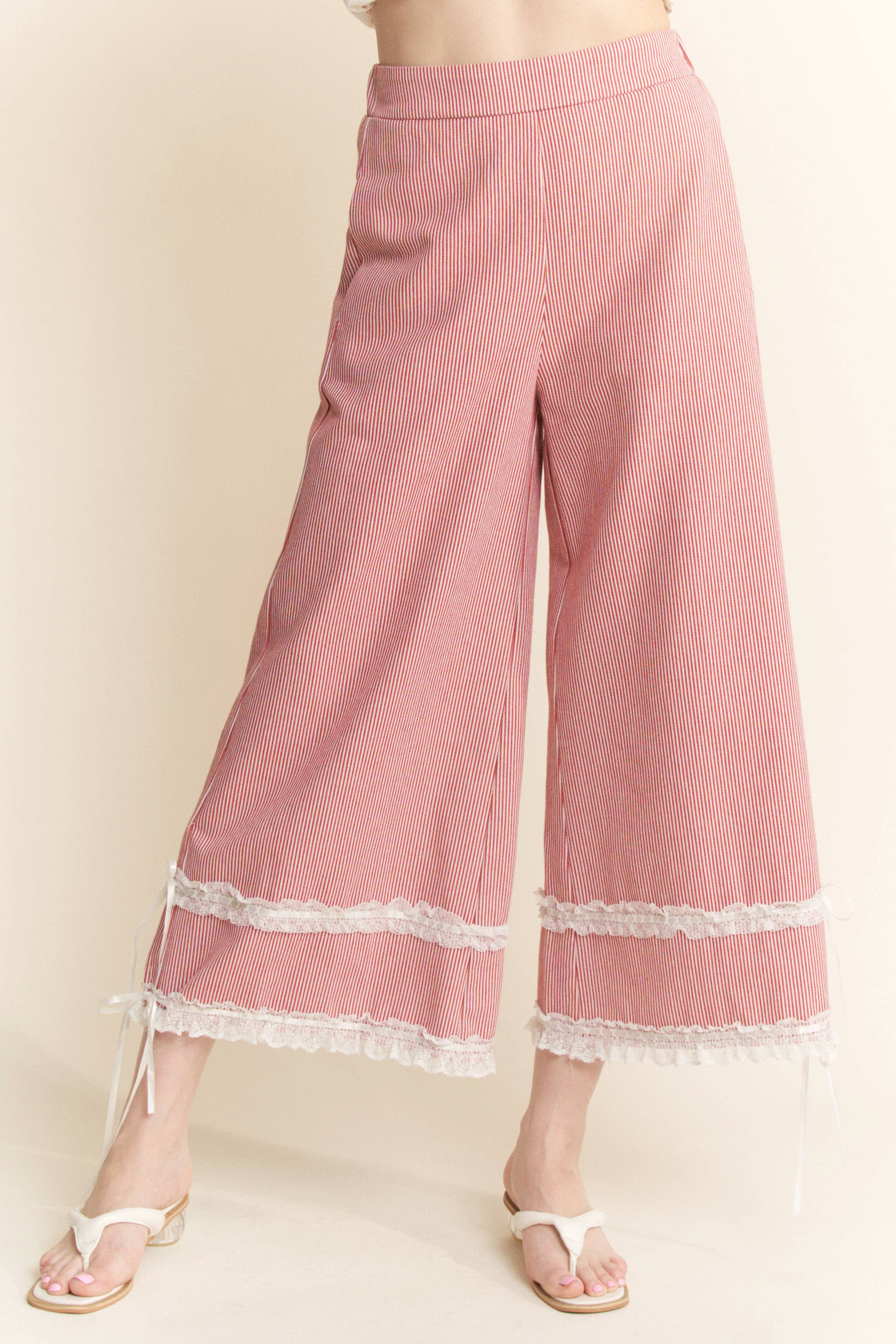 WASHED STRIPE RUFFLE LACE BOTTOM DETAIL WIDE OPENING CROPPED PANTS
