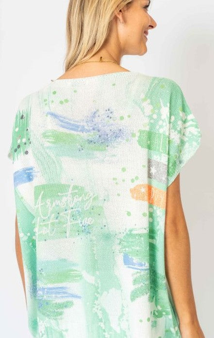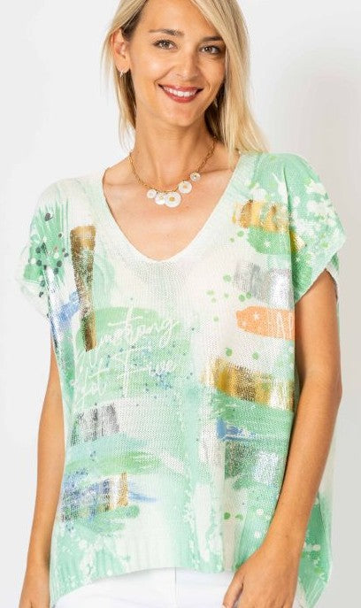 Writing and Foil Sweater. Large body, gold and silver shimmer on front, print front and back.